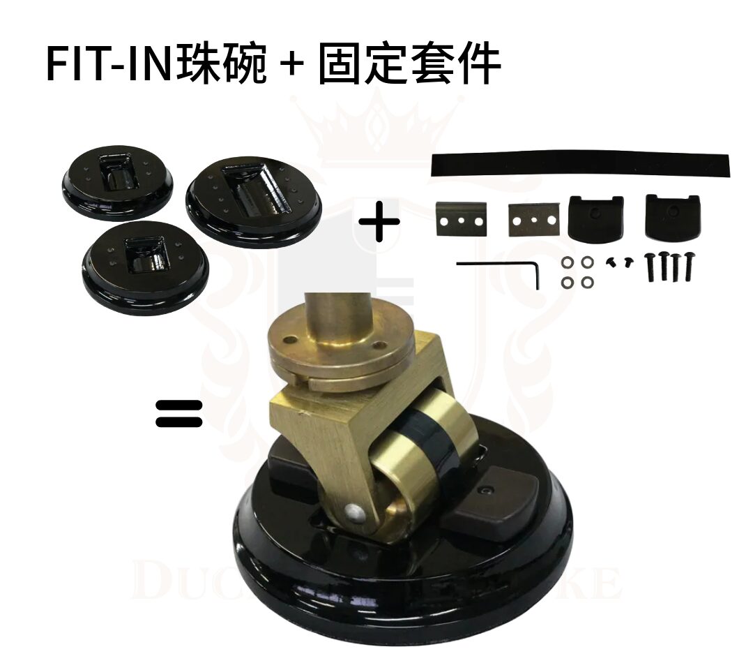 FIT-IN珠碗有鋼琴輪的弧線,能緊密扣合輪子形狀,再以零件進一步綁定琴輪在珠碗上,達到防滾出效果。