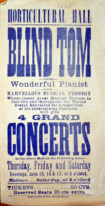 8歲時,Thomas Wiggins被出租給音樂會規劃人,以「”Blind” Tom Wiggins」的名字,開啟長達十幾年的音樂巡迴生涯。