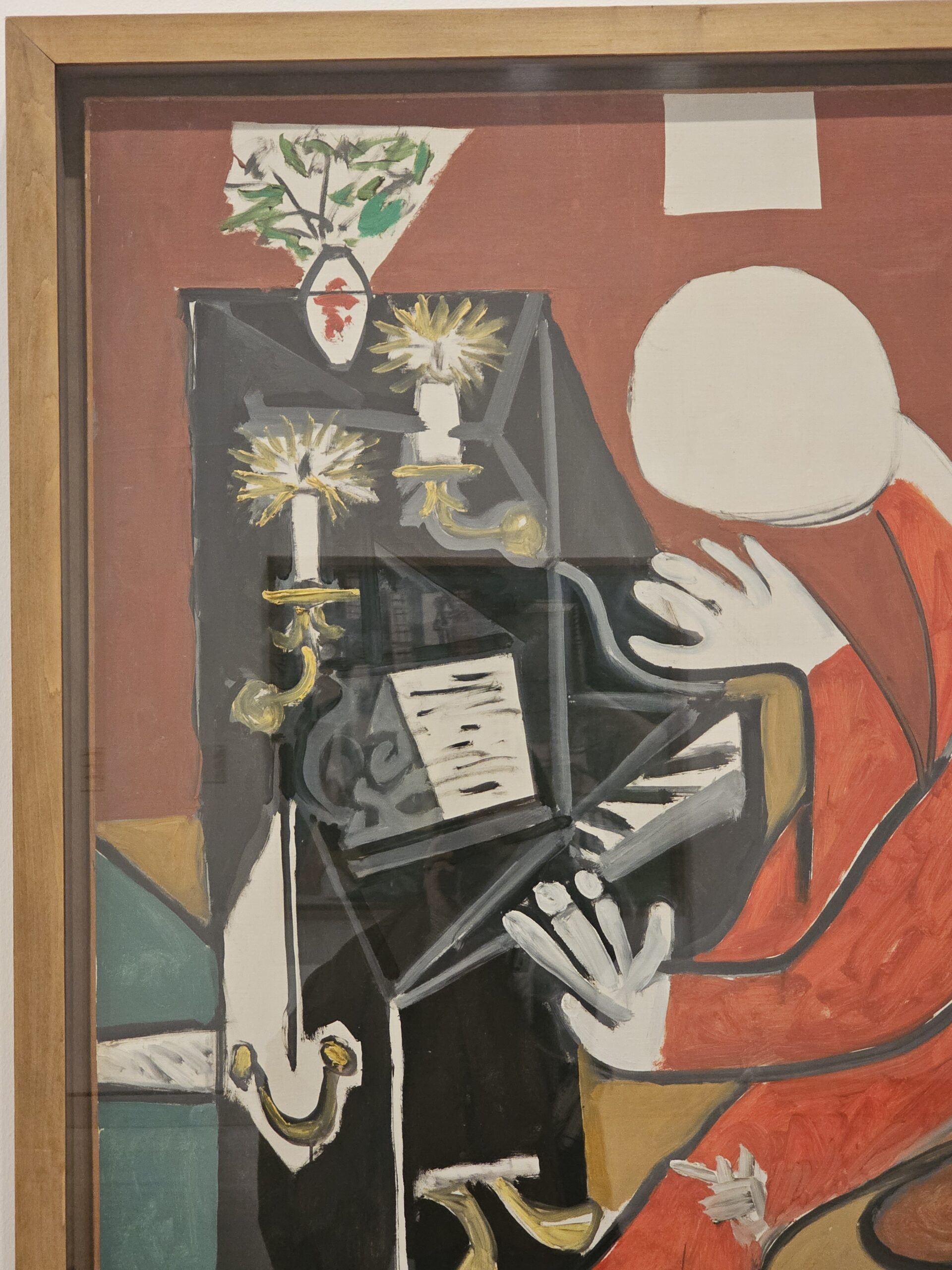 畫中一位紅衣人物坐在鋼琴前彈奏,畢卡索將鋼琴、燭台、狗等元素透過幾何形狀拆解與重組,營造獨特空間感。