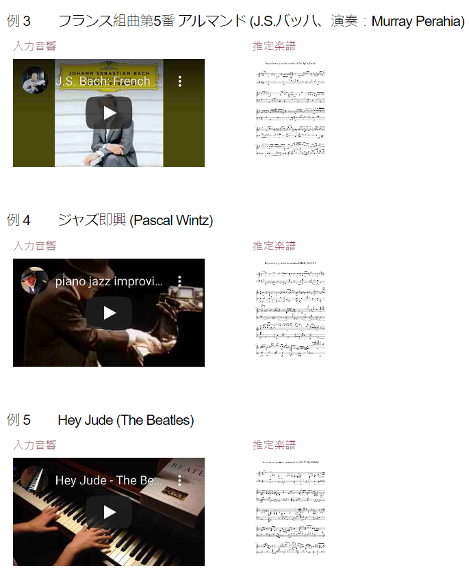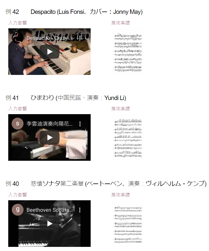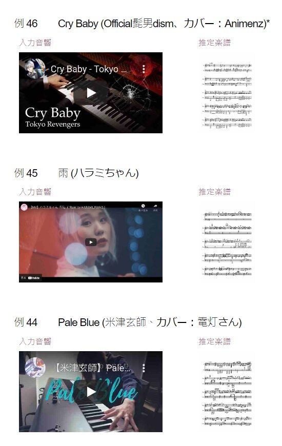 從中村栄太教授的研究技術官網,可看到團隊目前使用AI採譜技術的多樣成果;實驗樣本有古典鋼琴、各式流行音樂(J-POP、K-POP)甚至在公共場所直拍的現場彈奏等。