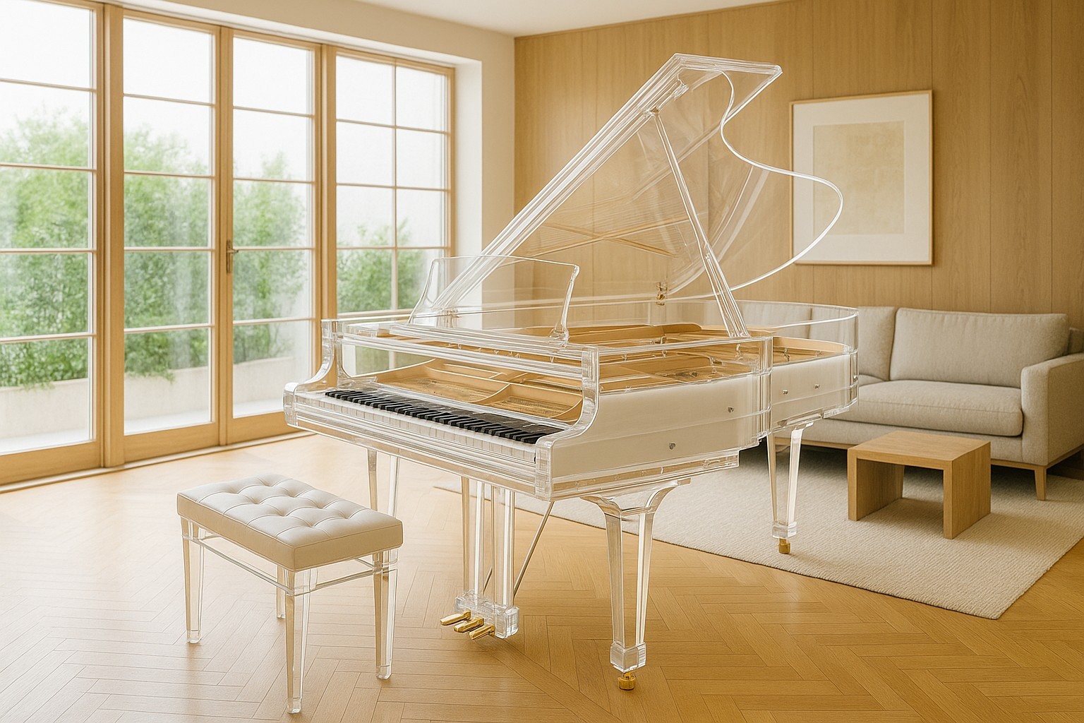雖然外型材質不同,但鋼琴的音色主要來自 響板、琴弦與機械結構,而非外殼本身。只要內部機構維持傳統結構,透明亞克力外殼幾乎不會對聲音造成顯著影響;可能會有輕微差異,但對一般聆聽者來說不易察覺。
