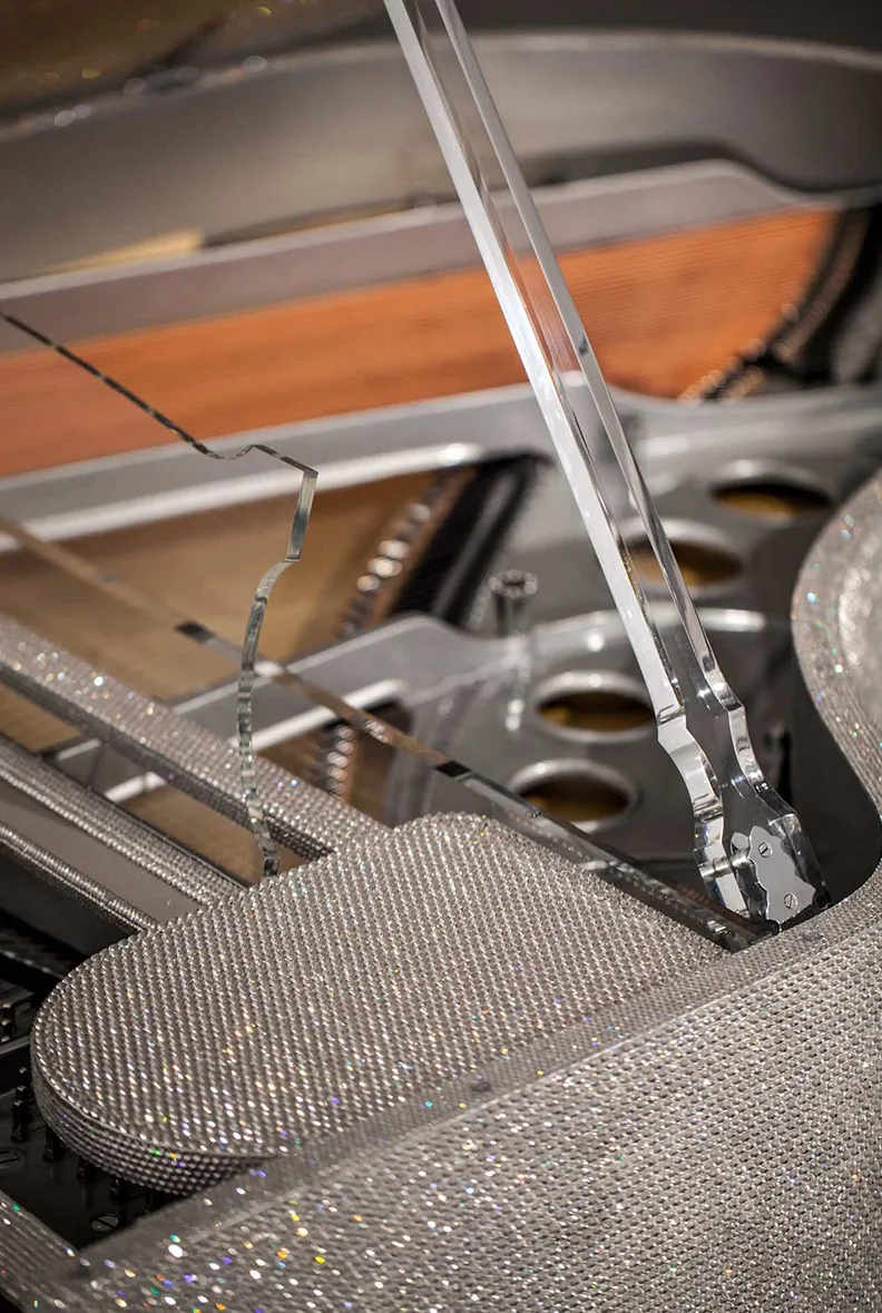 英國 Goldfinch Piano 與藝術家 Lauren Baker 合作,將一台 Steinway 平台琴全身貼覆 超過 50 萬顆施華洛世奇水晶,耗時半年打造,專為中東收藏家訂製,造價超過 50 萬英鎊。