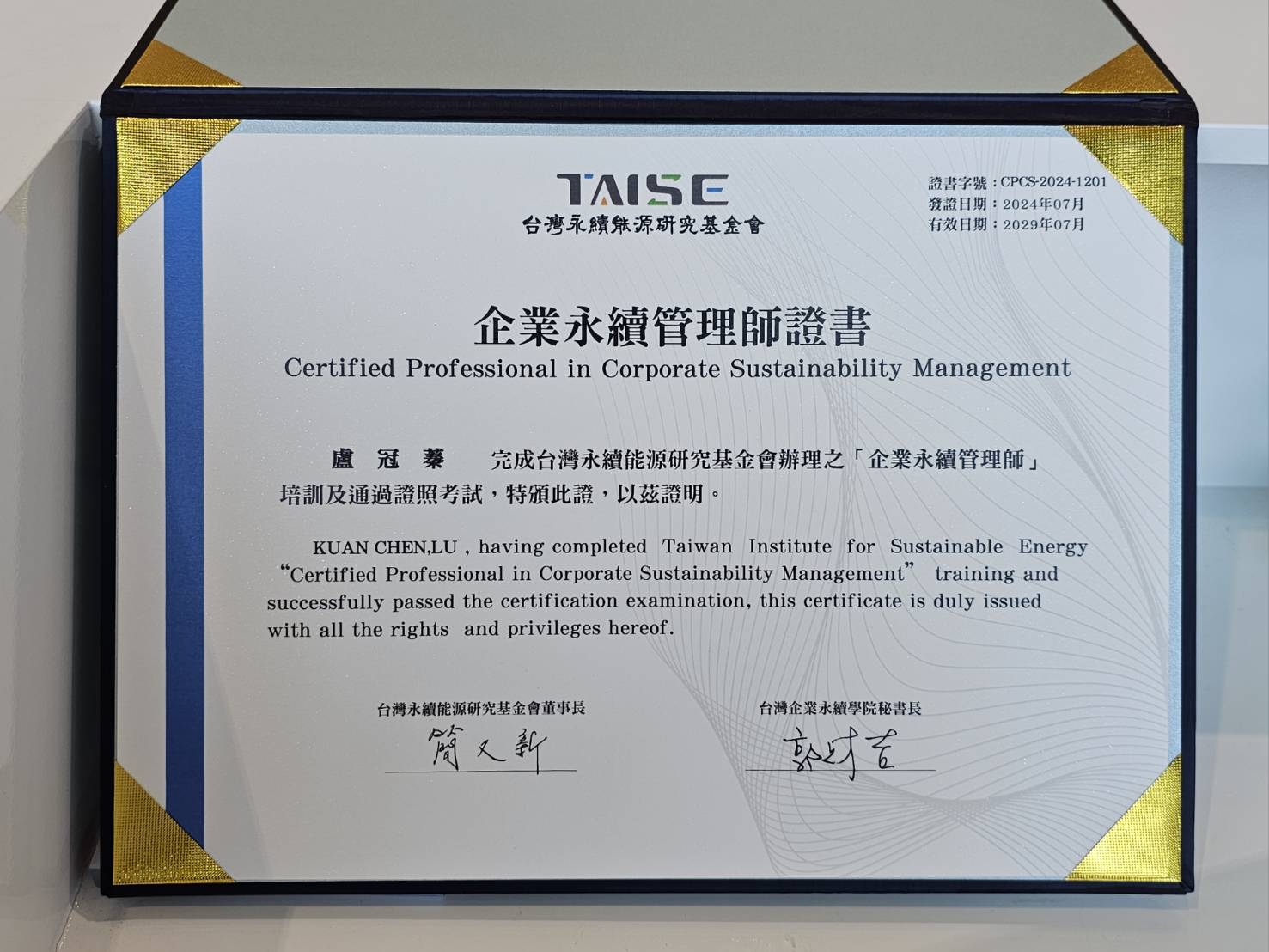 為落實社會責任,本公司贊助職員考取TAISE永續管理師證照,實現全員證照化的理想,打造實質意義上更專業、更具競爭力同時更人性化的團隊。