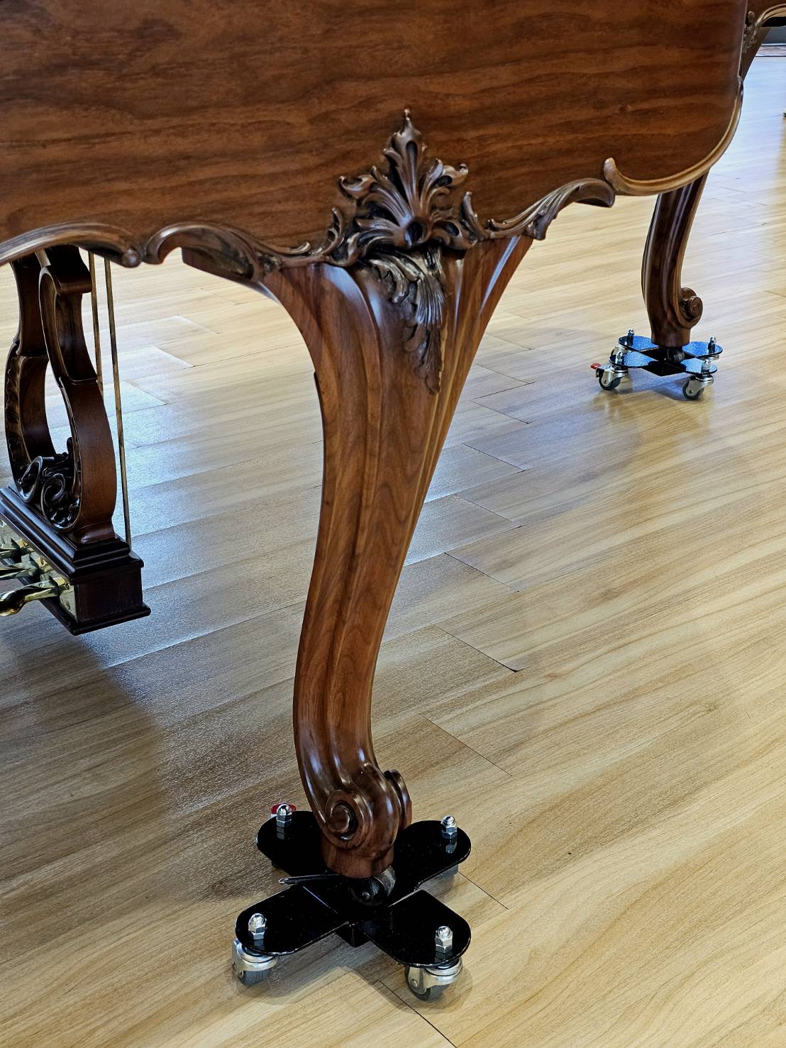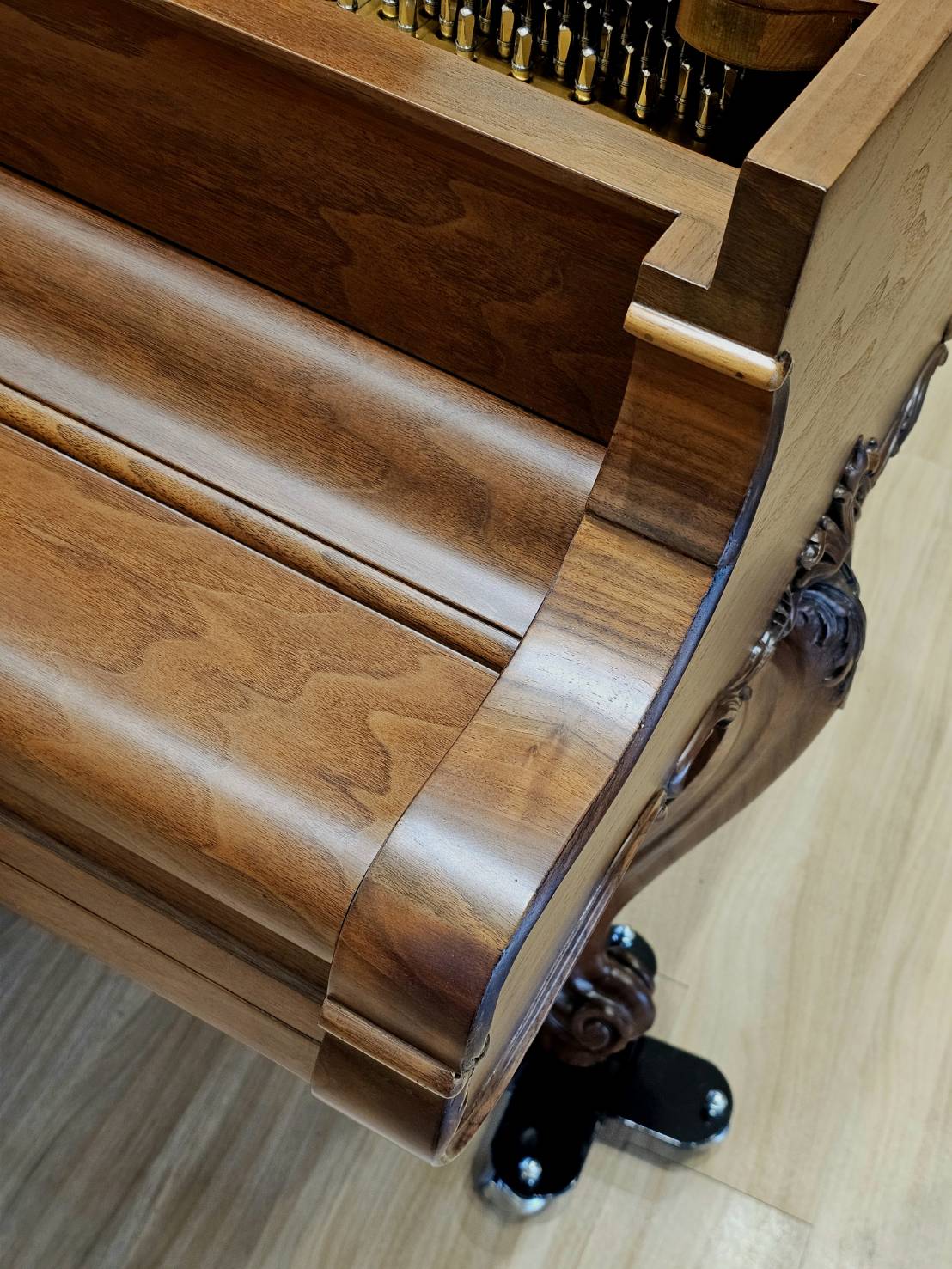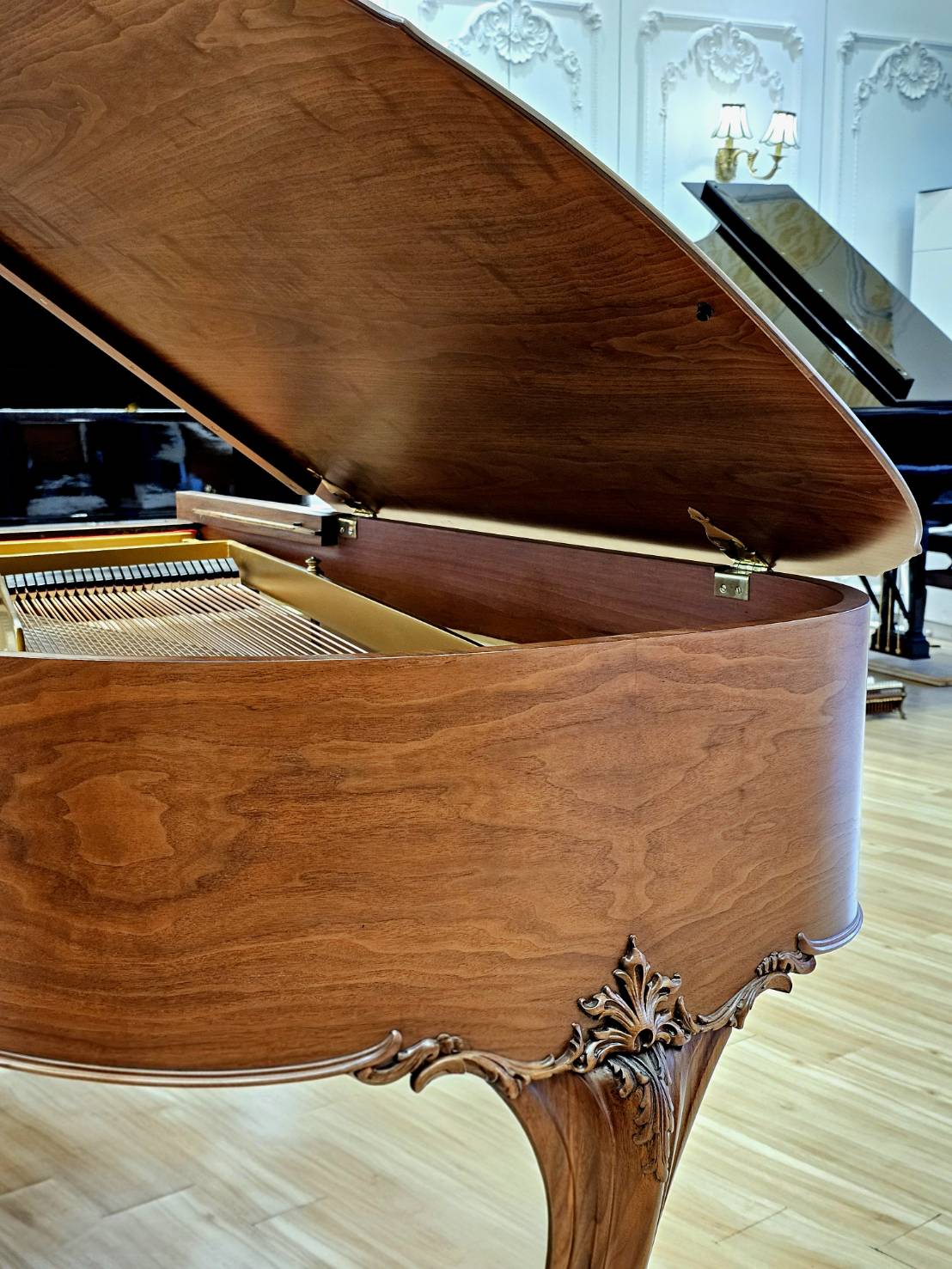 華美的胡桃木融入路易十五Louis XV雕刻風格,琴蓋更採用華麗的扇形裝飾,彰顯精緻工藝與古典美感,將18世紀法國的優雅風華細膩呈現於整體造型中。